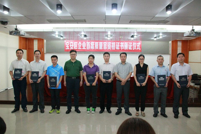 九月是全國質(zhì)量月,在深圳市副市長(zhǎng)陳彪的指示下,深圳開展了一系列的質(zhì)量月活動(dòng),其中作為活動(dòng)之一的“首席質(zhì)量官CQO培訓(xùn)考試”工作已經(jīng)告一段落。近日在寶安區(qū)市場(chǎng)監(jiān)督管理局舉行頒發(fā)CQO證書大會(huì),我公司質(zhì)量部周經(jīng)理喜獲考核通過,獲得了首席質(zhì)量官證書,應(yīng)邀參加了此次頒發(fā)證書活動(dòng)。