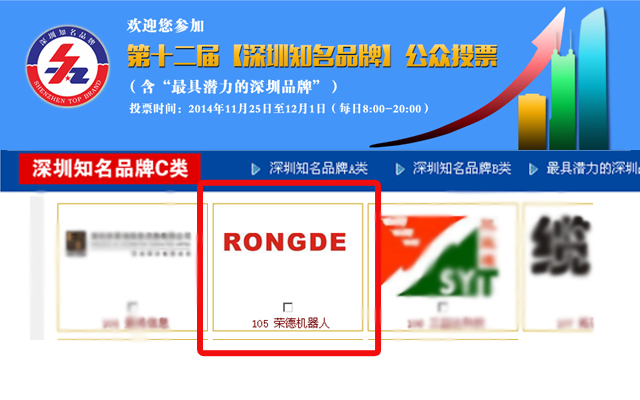 2014年,深圳市榮德機器人科技有限公司作為國家級高新技術企業(yè),廣東省名牌產品,成功入選第十二屆“深圳知名品牌”評選活動,并定于2014年11月25日至12月1日(每天8:00-20:00)進行公眾投票,投票結果直接決定公司是否被評選上。所以特請各位朋友幫忙榮德公司投上一票。謝謝!投票具體規(guī)則如下: