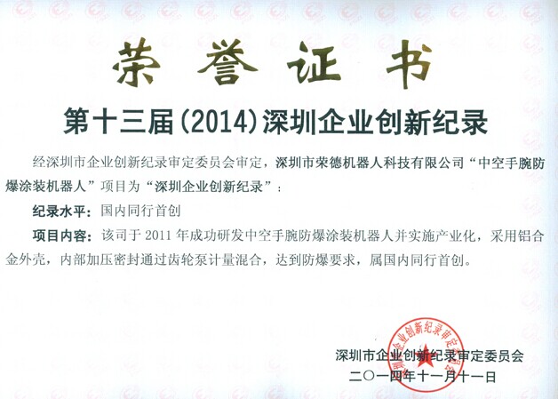 近日,由深圳市企業(yè)創(chuàng)新紀(jì)錄審定委員會(huì)為深圳市榮德機(jī)器人科技有限公司頒發(fā)了“第十三屆(2014)深圳企業(yè)創(chuàng)新紀(jì)錄”的榮譽(yù)證書,榮德公司自主研發(fā)制造的“中空手腕防爆涂裝機(jī)器人”榮獲“產(chǎn)品創(chuàng)新項(xiàng)目獎(jiǎng)”以及“深圳企業(yè)創(chuàng)新紀(jì)錄”兩項(xiàng)大獎(jiǎng),紀(jì)錄水平為“國內(nèi)同行首創(chuàng)”。