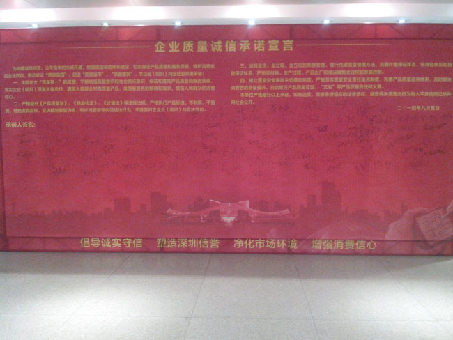 大會的高潮部分是所有與會的企業(yè)代表與政界代表一起舉起右手,宣讀《企業(yè)質(zhì)量誠信承諾書》:為構(gòu)建誠信經(jīng)營、公平競爭的市場環(huán)境,加強質(zhì)量誠信體系建設(shè),切實保證產(chǎn)品質(zhì)量,維護消費者的合法權(quán)益,推動建設(shè)“質(zhì)量強國”,促進“質(zhì)量強市”、“質(zhì)量惠民”。本企業(yè)向社會鄭重承諾:一、牢固樹立“質(zhì)量第一”的思想,不斷增強質(zhì)量意識和社會責(zé)任意識,保證和提高產(chǎn)品質(zhì)量,落實企業(yè)質(zhì)量主體責(zé)任,滿足人們?nèi)罕妼Ω哔|(zhì)量產(chǎn)品的期待和需求,增強人民群眾的消費信心。二、嚴(yán)格遵守《產(chǎn)品質(zhì)量法》、《標(biāo)準(zhǔn)化法》、《計量法》等法律法規(guī),嚴(yán)格執(zhí)行產(chǎn)品標(biāo)準(zhǔn),不制假、不售假,杜絕虛假宣傳,堅決抵制假冒偽劣、欺詐消費者等失信違法行為,不侵害其他企業(yè)合法權(quán)益。三、加強全員、全過程、全方位的質(zhì)量管理,推行先進質(zhì)量管理方法,完善計量保證體系、標(biāo)準(zhǔn)化體系和質(zhì)量保證體系,嚴(yán)格原材料,生產(chǎn)過程、產(chǎn)品出廠和儲運銷售全過程的照顧質(zhì)量控制。四、建立質(zhì)量安全事故主動報告制度,嚴(yán)格落實質(zhì)量安全責(zé)任追究制度,完善產(chǎn)品質(zhì)量追溯體系,及時解決消費者的質(zhì)量投訴,自覺履行產(chǎn)品質(zhì)量召回、“三包”等產(chǎn)品質(zhì)量責(zé)任和義務(wù)。本單位嚴(yán)格履行以上承諾。如有違反,愿意承擔(dān)相應(yīng)的法律責(zé)任,接受將失信違法行為納入不良信用記錄并向社會公開。二0一四年九月五日