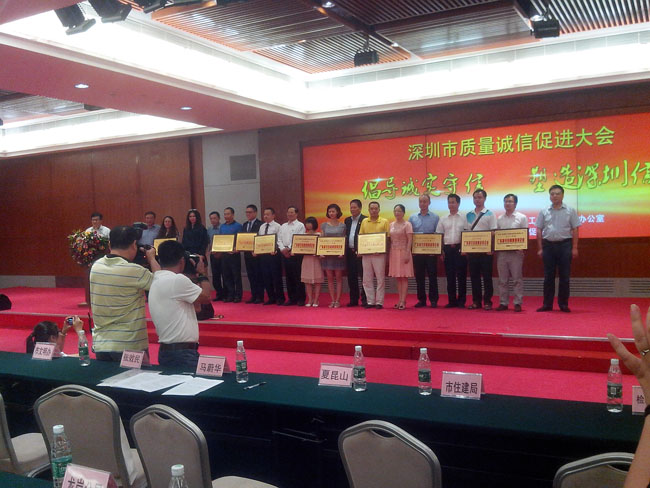 大會最后一項議程是頒發(fā)2013年“廣東省守合同重信用”證書及牌匾,我公司代表也受邀請上臺領(lǐng)取證書及牌匾。